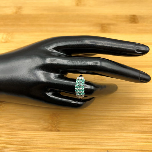 925 Silver Classic Green Zambian Emerald & White Topaz Cut Stone Ring - Size 7