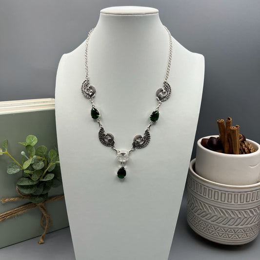 925 Silver Classic Peacock Motifs Green Chrome Diopside & White Topaz Cut Stone Necklace Set