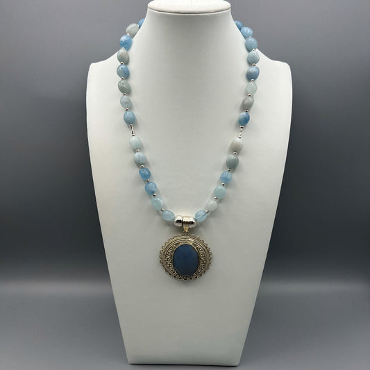 925 Silver Trendy Handcrafted Blue Aquamarine Single Strand Chunky Bead Necklace Set
