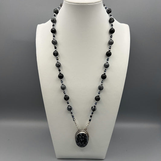 925 Silver Trendy Handcrafted Black Snowflake Obsidian & Silver Haematite Single Strand Long Bead Necklace Set