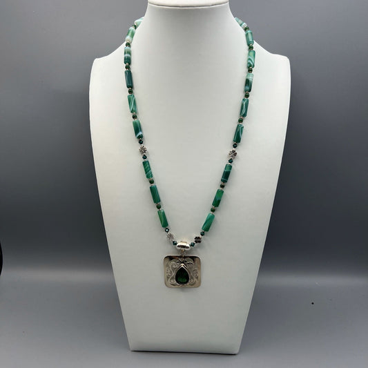 925 Silver Trendy Handcrafted Green Botswana Agate & Green Hydro Single Strand Bead Long Necklace Set