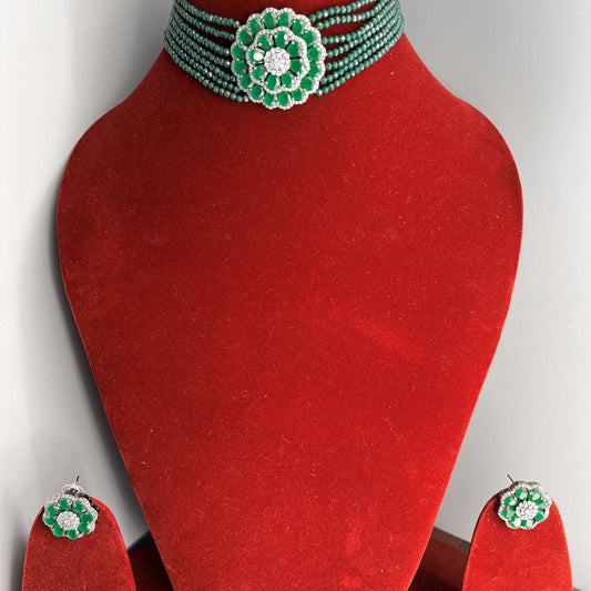 Fashion - Victorian Finish Floral Design Dark Green AD/CZ Stone, Bead Mix Choker Necklace Set