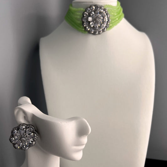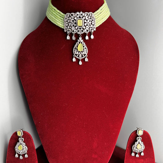 Fashion - Victorian Style Mint Green Beads, White AD/CZ Stone, Bead Mix Choker Necklace Set
