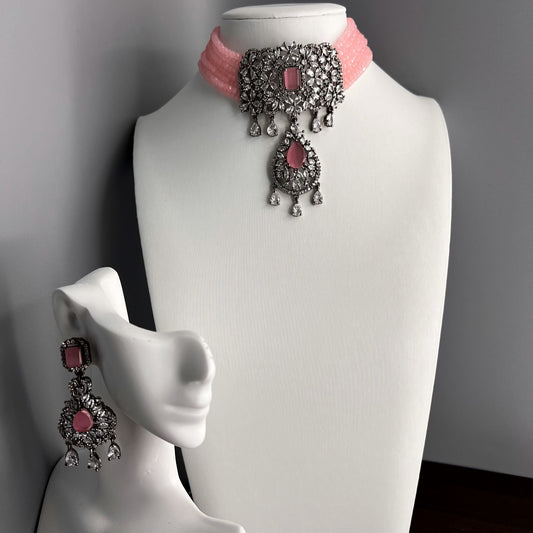 Fashion - Victorian Style Pink Beads & AD/CZ Stone, Bead Mix Choker Necklace Set