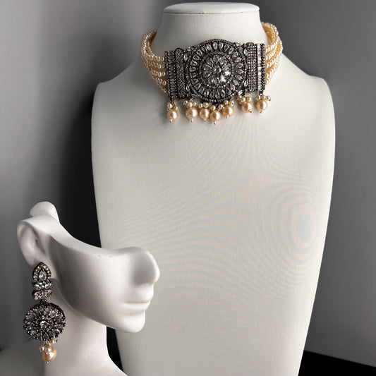 Fashion Premium - Victorian Inspired Grey AD/CZ Stone, Bead Mix Choker Necklace Set