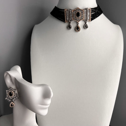 Fashion - Victorian Style Black Beads & AD/CZ Stone, Bead Mix Choker Necklace Set