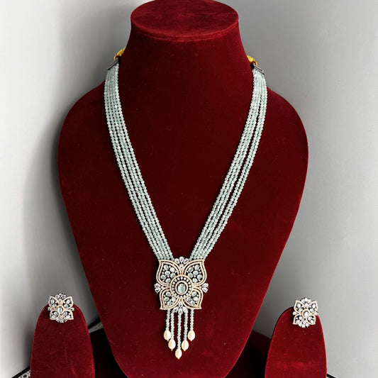 Fashion Premium - Victorian Inspired Mint Green AD/CZ Stone, Bead Mix Mala Necklace Set