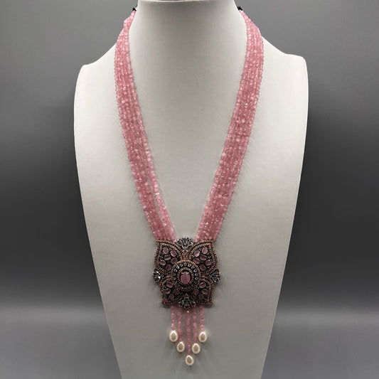 Fashion Premium - Elegant Rose Pink Beads & AD/CZ Stone With Black Plating Necklace Set