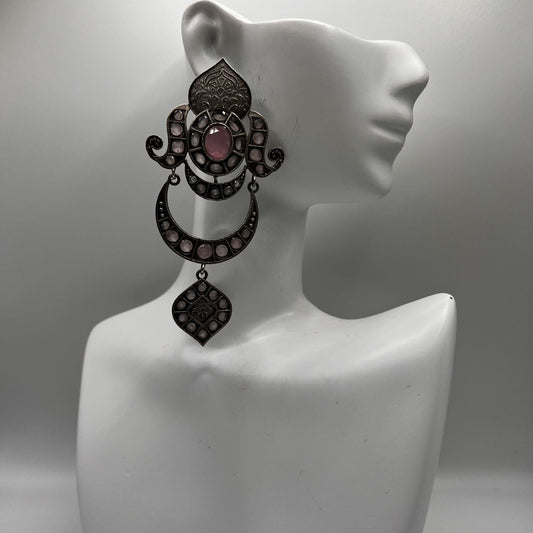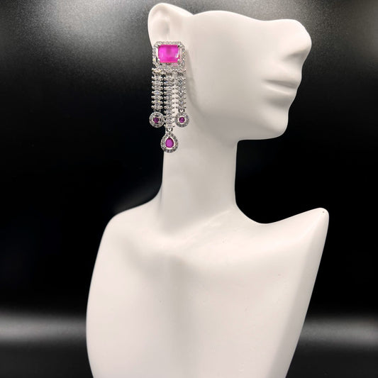 Fashion - Trendy Pink Color Oxidized/Silver Tone Chandelier Earrings