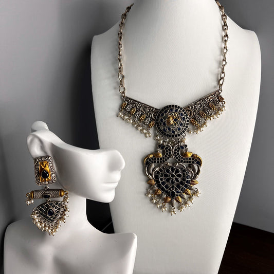 Fashion - Trendy Silver Replica Statement Peacock Design Navy Blue Dual Tone Oxidized Necklace Set