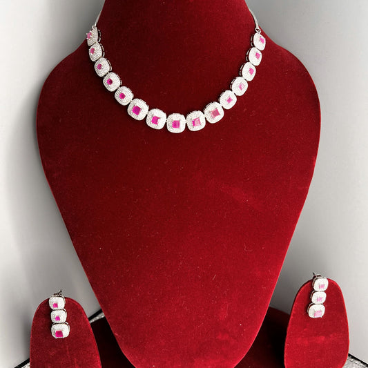 Fashion Premium - Trendy Square Design Ruby Pink AD/CZ Stone Necklace Set
