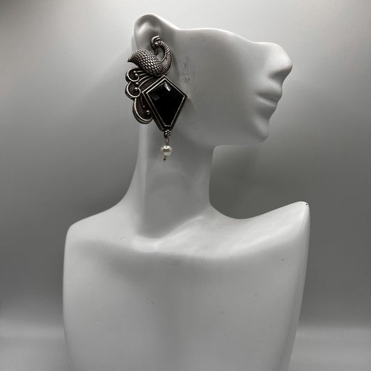 Fashion - Peacock Design Classic Black Color Oxidized/Silver Tone Stud Earrings