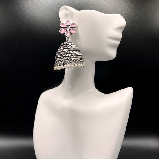 Fashion - Classic Pink Color Oxidized/Silver Tone Jhumka Earrings