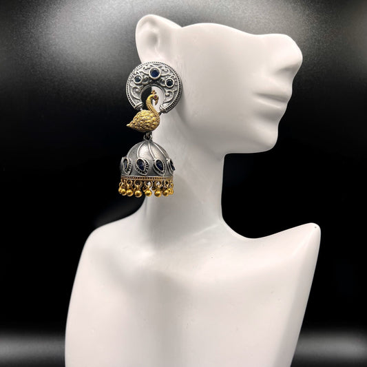 Fashion - Peacock Design Classic Navy Blue Color Oxidized/Silver Tone Jhumka Earrings