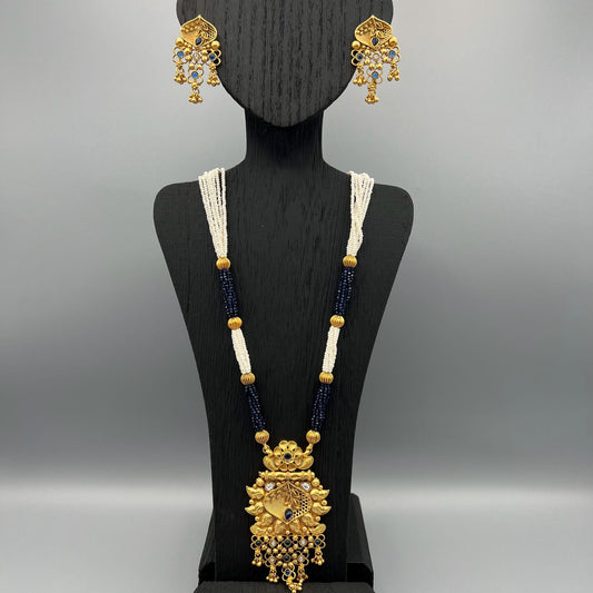 Fashion - Rajwadi Style Leaf Pattern Navy Blue Antique Traditional, Bead Mix Necklace Set