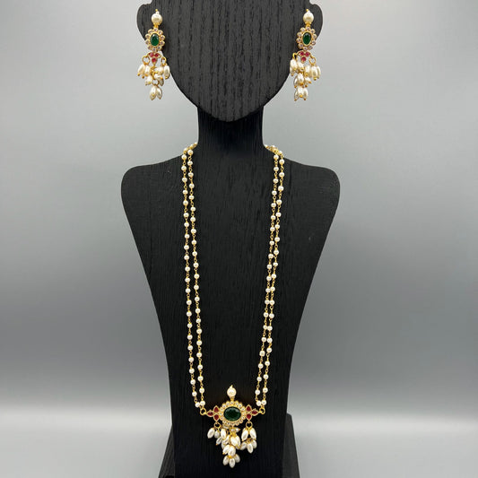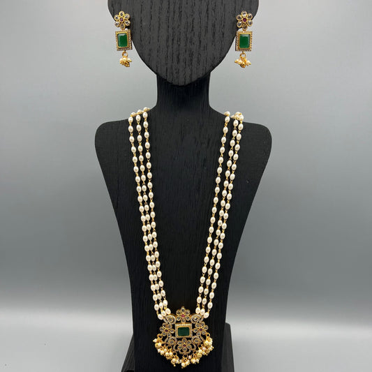 Fashion - Traditional Design Pearl, Green & White Antique Traditional, Bead Mix Long Necklace Set