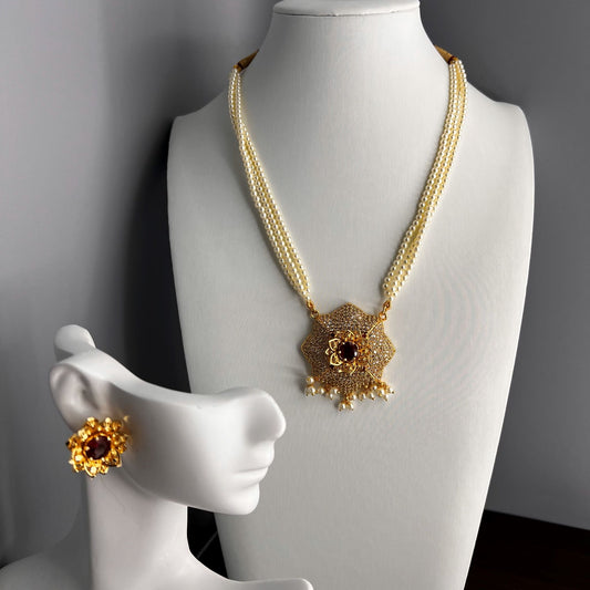 Fashion - Tanmani Design 3 Strand Pearl, Ruby Pink & White Antique Traditional, Bead Mix Necklace Set