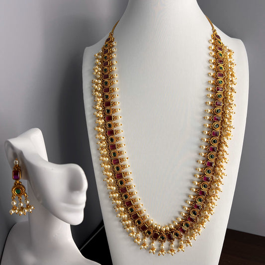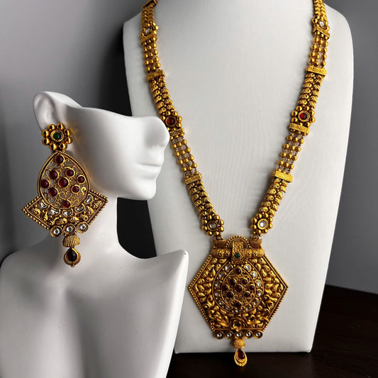 Fashion - Designer Festive Dark Red, Green Antique Traditional Long Necklace Set