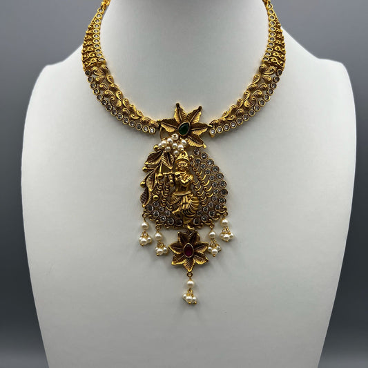 Fashion - Lord Krishna Ruby Pink & Green Antique Traditional Temple Necklace Set