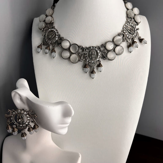 Fashion - Unique Peacock Design Lord Shiva Trident White Oxidized Temple Necklace Set
