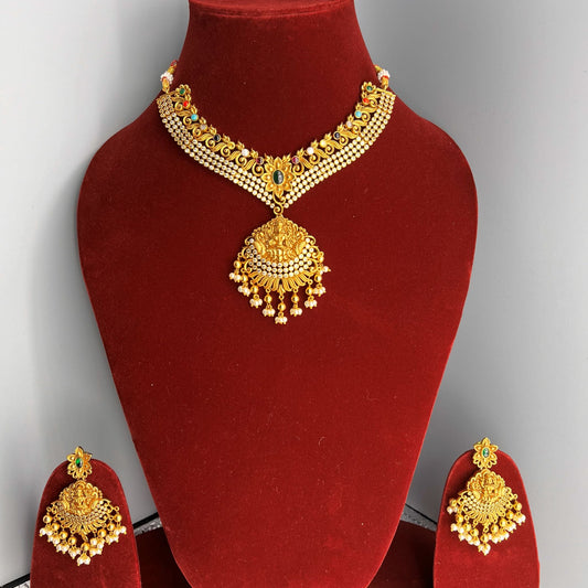 Fashion Premium - Gold Replica Beautiful Navaratna Multi Color Goddess Lakshmi Antique Traditional Necklace Set