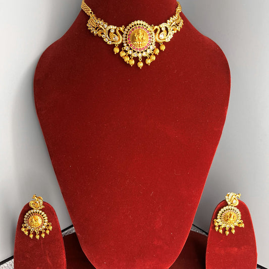 Fashion Premium - Gold Replica Ruby Pink Goddess Lakshmi & Peacocks Antique Traditional Choker Necklace Set