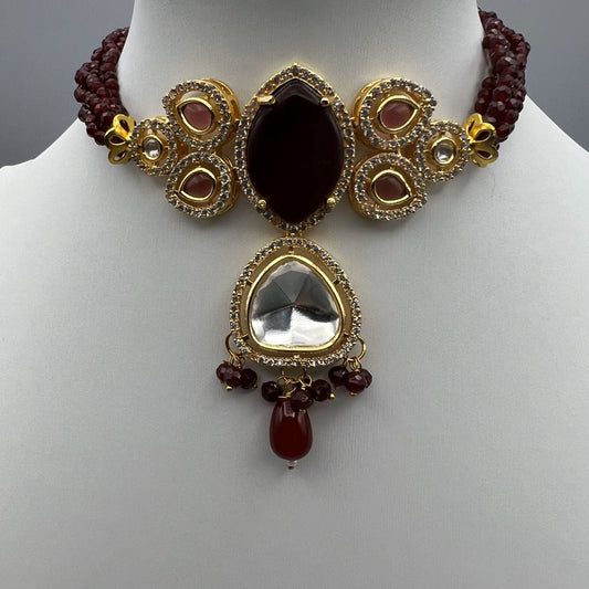 Fashion - Pretty Dark Red Kundan, Bead Mix Choker Necklace Set