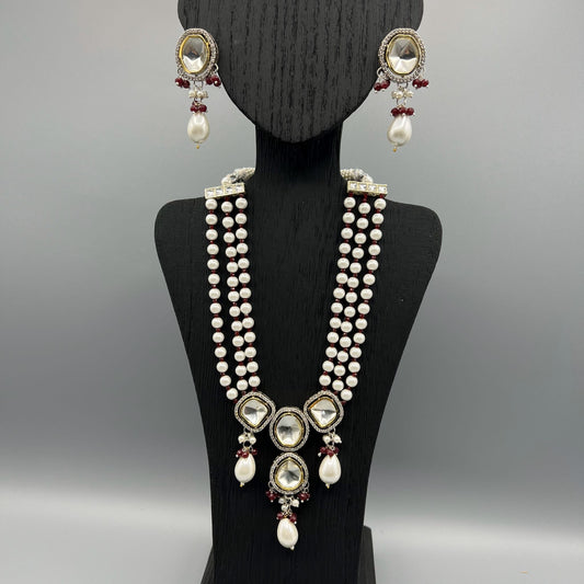 Fashion - One-Of-A-Kind Pearl, Dark Red & White Kundan, Bead Mix Necklace Set