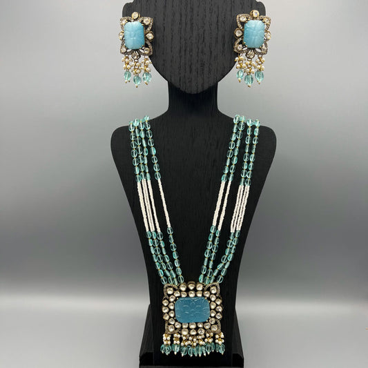 Fashion - Exclusive Designer Blue Carved Stone Kundan Moissanite Polki, Bead Mix Long Necklace Set