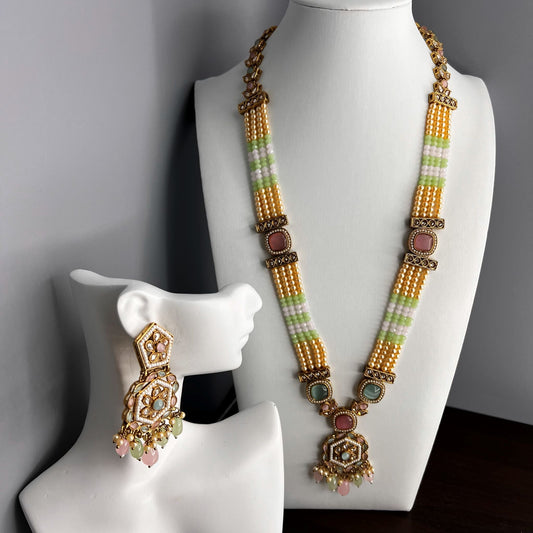 Fashion - Mint Green & Pink Color Monalisa Stone, Bead Mix Long Necklace Set