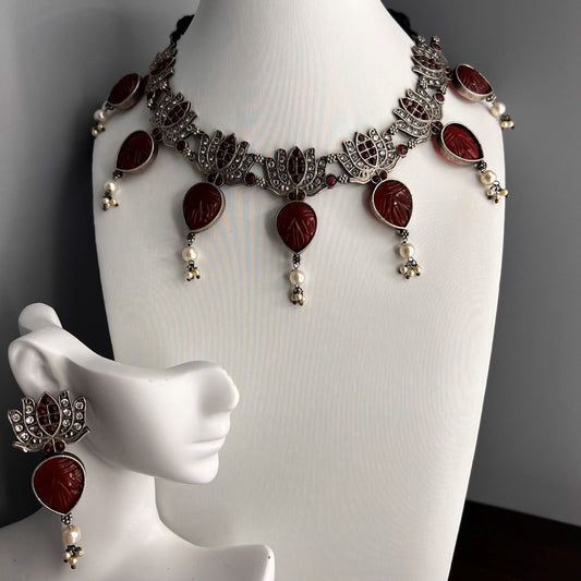 Fashion - Designer Lotus Design With Dark Red Carved Stone Oxidized Necklace Set