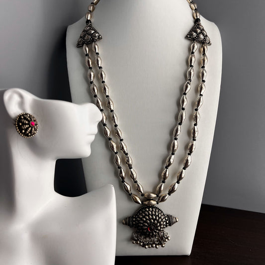 Fashion - Silver Replica Peacock Design Silver Oxidized Long Matar Mala Pendant Set