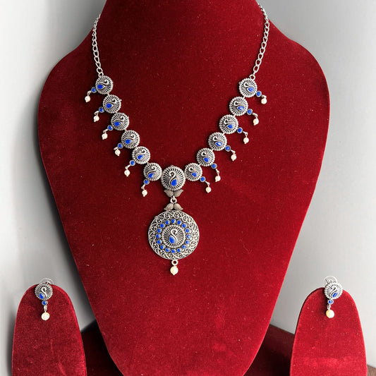 Fashion - Blue Peacock Motifs Oxidized Necklace Set