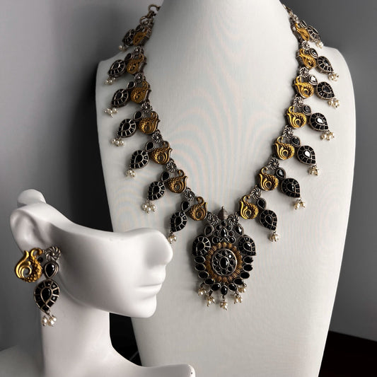 Fashion - Statement Designer Peacock Design Black Color Dual Tone Oxidized Necklace Set