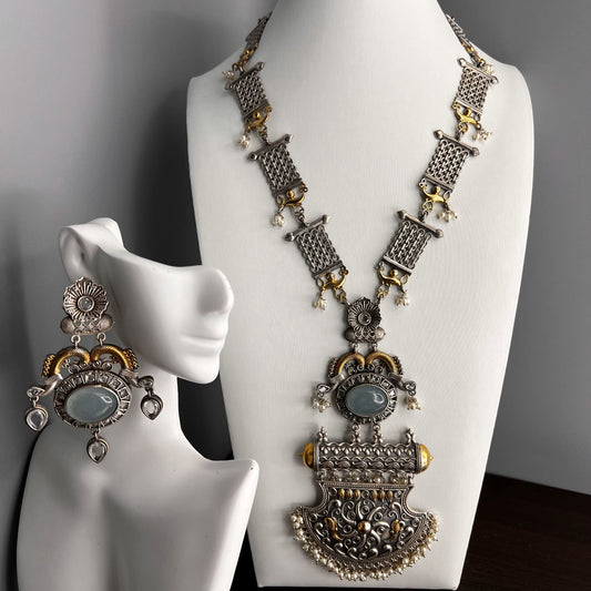 Fashion - Exclusive Peacock Design Light Blue Dual Tone Oxidized Long Necklace Set
