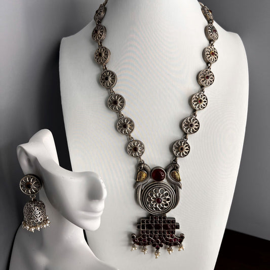 Fashion - Exclusive Peacock Design Ruby Pink Oxidized Long Necklace Set