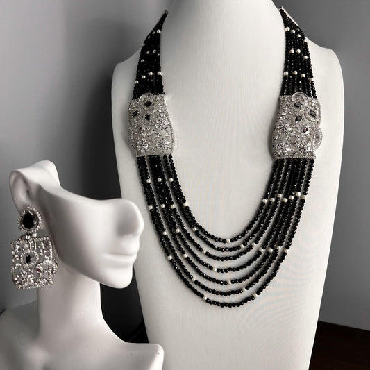 Fashion - Exclusive Designer Peacock Design Black Beads & AD/CZ Stone, Bead Mix Long Necklace Set