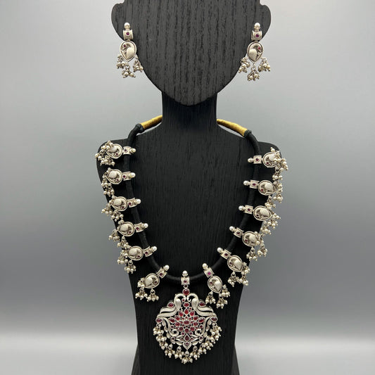Fashion - Silver Replica Elegant Peacock Design Ruby Pink Oxidized Thread Necklace Set
