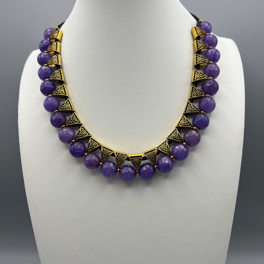 Fashion - Violet Agate Beads Oxidized Antique Gold Tone Thread Necklace Set